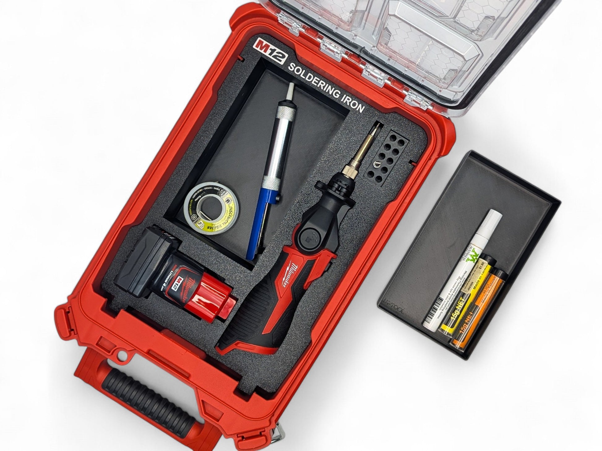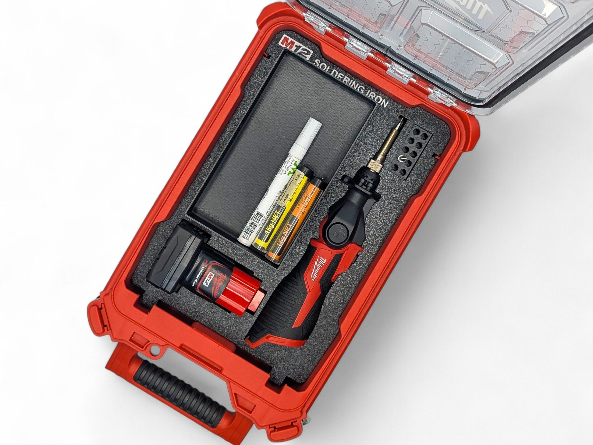 The Milwaukee Packout Compact Organizer 48-22-8435, M12 Soldering Iron, M12 Batteries and accessories shown are not a part of the sale and are shown for demonstration purposes to showcase the product. We have no affiliation with the Milwaukee brand.
