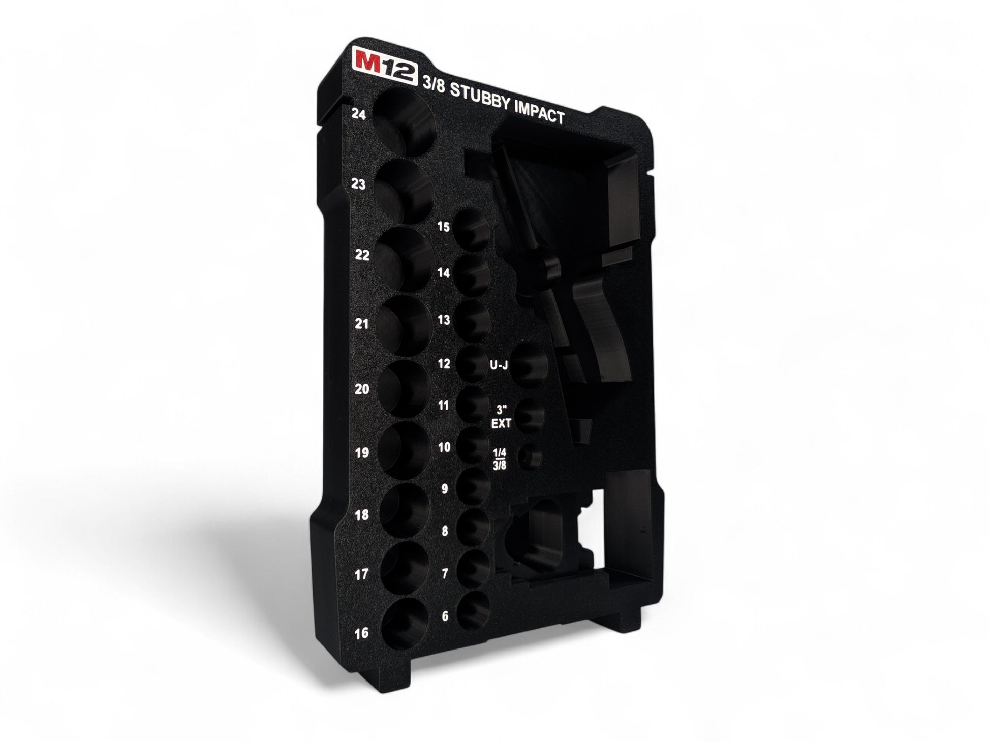 Personalize your Milwaukee Packout with the M12 3/8 Stubby Impact Wrench (Gen2) 19PC Deep Metric Socket Set Insert to suit the Compact Organizer. With 3’’ Extension (75mm), Universal joint, 1/4 hex to 3/8 adaptor and additional storage under the 3/8 Stubby for the 6" (150mm) 3/8 Extension. Each individual accessory that is supplied with the tool and socket set is meticulously modeled into the 3D print with clear labeling next to the corresponding socket. This insert features our dual battery design and is meticulously modelled to ensure a snug fit of your tools and accessories. Removal of 3/8 Stubby Impact Wrench skin can be done via the battery connection on the skin. Printed in PETG for a more durable product.