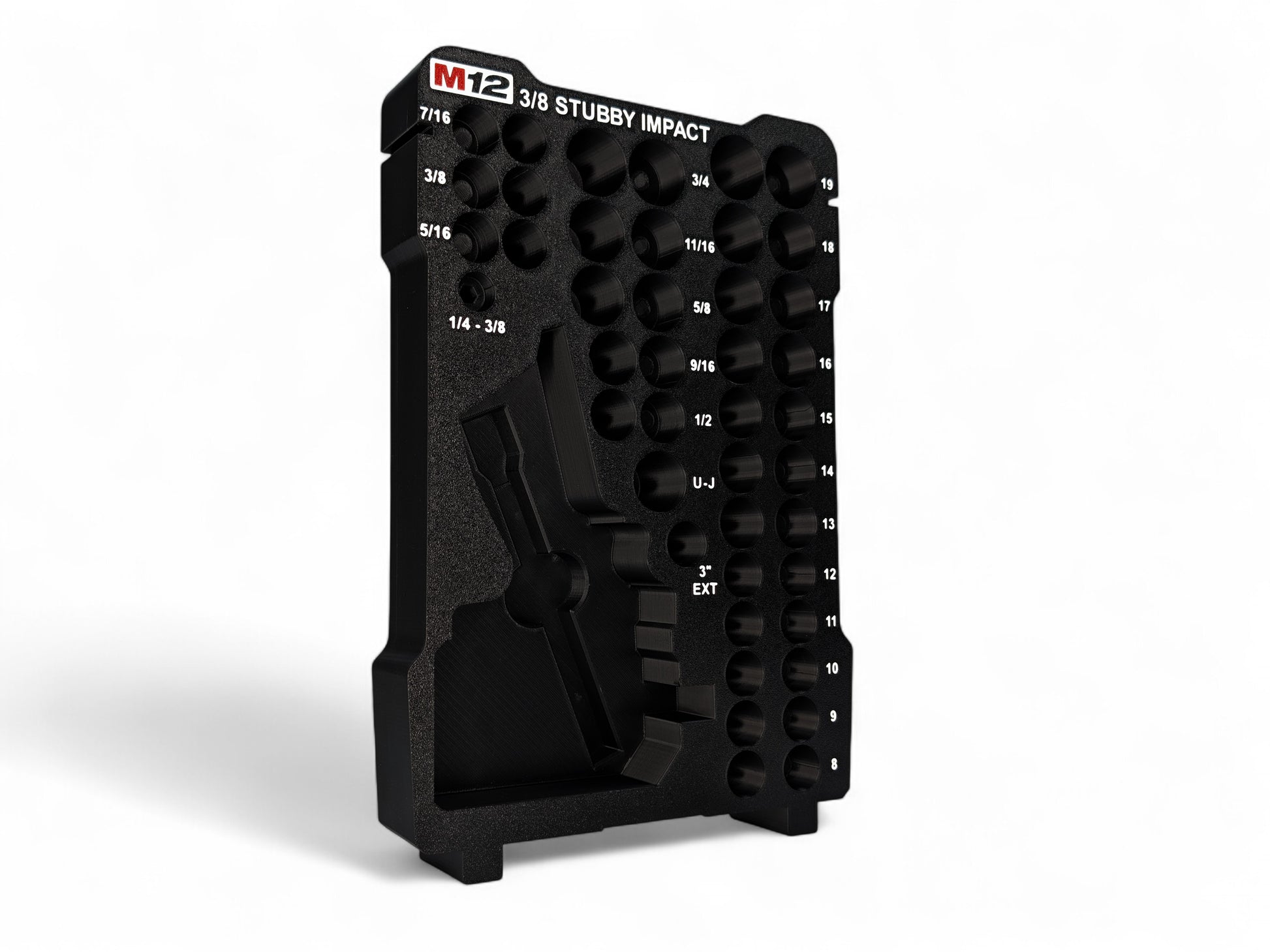 Personalize your Milwaukee Packout with the M12 3/8 Stubby Impact Wrench / 43PC SAE/Metric Socket Set Insert to suit the Compact Organizer with additional storage under the 3/8 Stubby for the 6" (150mm) 3/8 Extention. Each individual accessory that is supplied with the tool / Socket set is meticulously modeled into the 3d print with clear labeling next to the short height socket with the corresponding deep socket next to it. ensuring a snug fit keeping your tools and accessories secure . Removal of 3/8 Stubby Impact Wrench skin can be done via the battery connection on the skin . Printed in PETG for a more durable product.