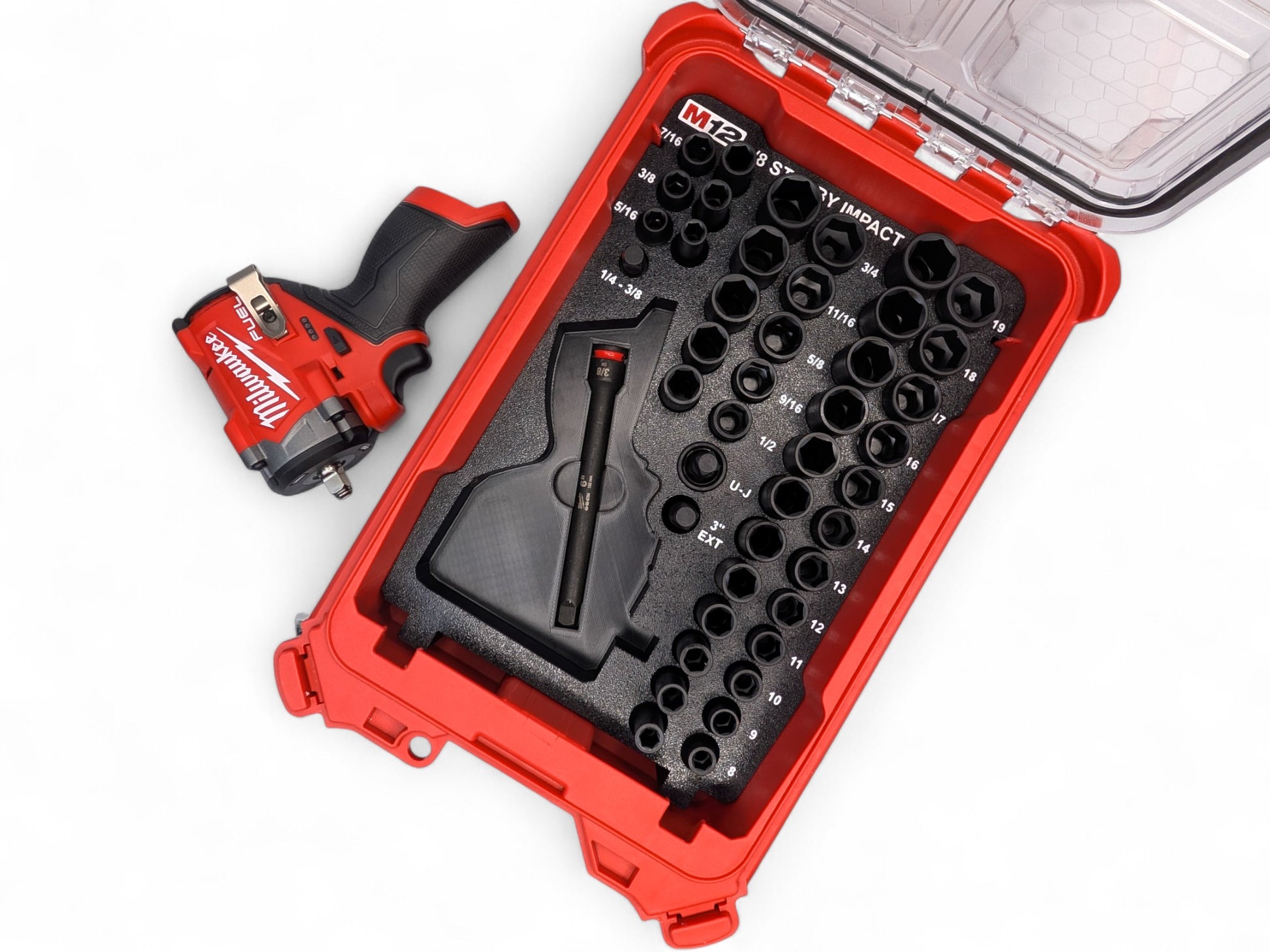 The Milwaukee Packout Compact Organizer 48-22-8435,M12 3/8 Stubby Impact Wrench, Sockets/Extension shown are not a part of the sale and are shown for demonstration purposes to showcase the product. We have no affiliation with the Milwaukee brand.