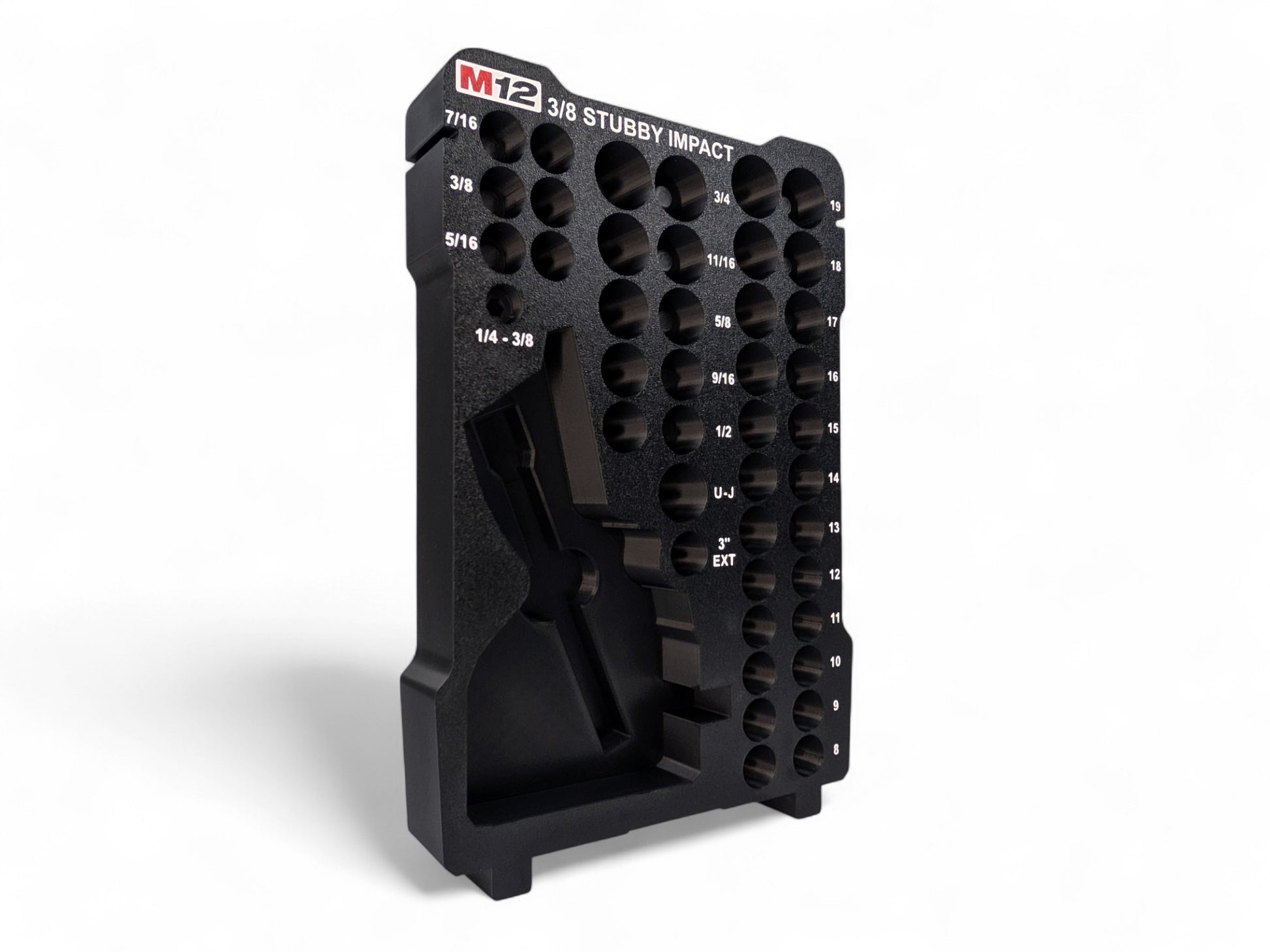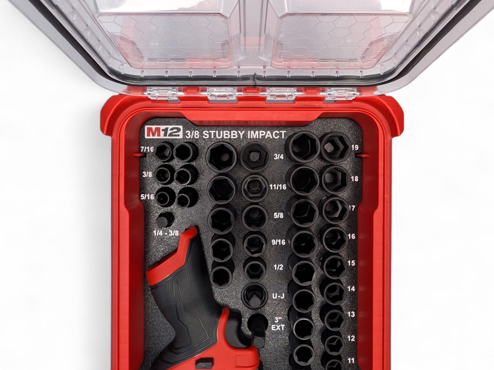 Personalize your Milwaukee Packout with the M12 3/8 Stubby Impact Wrench(Gen3) / 43PC SAE/Metric Socket Set Insert to suit the Compact Organizer with additional storage under the 3/8 Stubby for the 6" (150mm) 3/8 Extension. Each individual accessory that is supplied with the tool/socket set is meticulously modeled into the 3D print, ensuring a snug fit keeping your tools and accessories secure. Clear labeling displays the short height socket with the corresponding deep socket next to it. Removal of 3/8 Stubby Impact Wrench skin can be done via the battery connection on the skin . Printed in PETG for a more durable product.