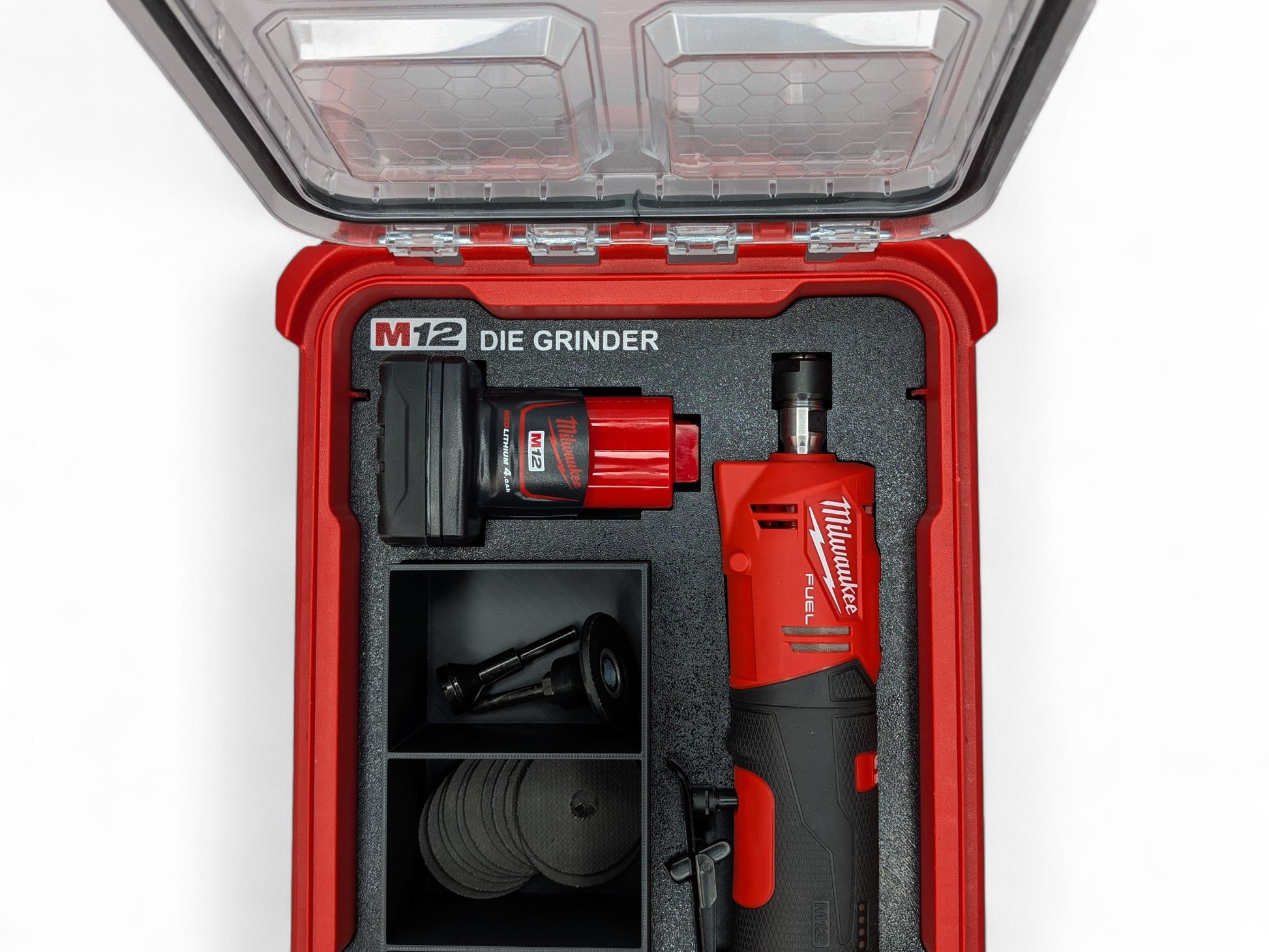 The Milwaukee Packout Compact Organizer 48-22-8435, M12 Die Grinder, accessories and M12 Batteries shown are not a part of the sale and are shown for demonstration purposes to showcase the product. We have no affiliation with the Milwaukee brand.
