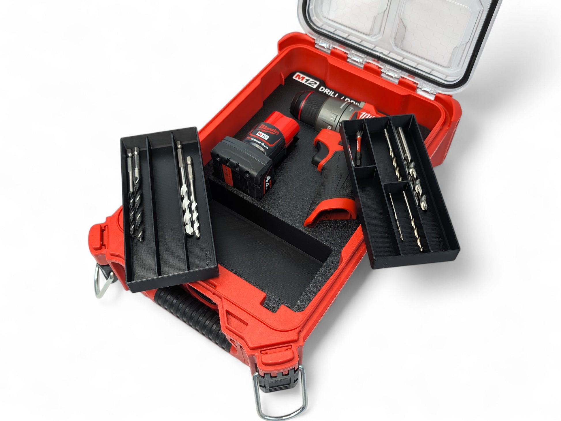 Personalize your Milwaukee Packout with the M12 Drill/Driver (Gen3) to suit the Compact Organizer. Each individual accessory that is supplied with the tool is meticulously modeled into the 3d print ensuring a snug fit keeping your tools and accessories secure. Also supplied are two removable stacking trays ideal for storing a wide variety of drill bits with larger bits being stored below the stacking bins, removal of drill skin can be done lifting via the battery connection on the skin, the skin can be stored with the belt hook and ¼” hex bits still attached as shown in the pictures. Printed in PETG for a more durable product.