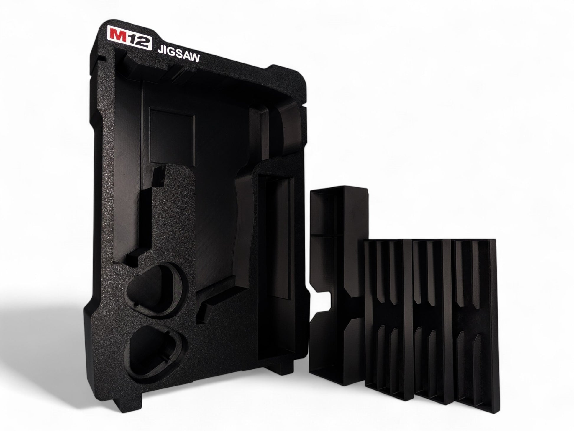 Personalize your Milwaukee Packout with the M12 Jigsaw Insert to suit the Compact Organizer. Featuring precision-modeled compartments custom-fitted for your jigsaw and accessories, delivering reliable organization and protection. Its three-tier storage bin design accommodates jigsaw blades up to 5 1/4" (132mm), complete with integrated storage for the acrylic chip guard and blade cover. A universal concealed compartment houses the 2 styles of dust hose attachments used worldwide. 2 dedicated slots secure CP batteries to keep your Jigsaw on the go. The insert allows tool removal from either the front or rear, or via the center grip point for convenient access. Constructed from durable PETG material, this insert integrates seamlessly with the Packout storage system.